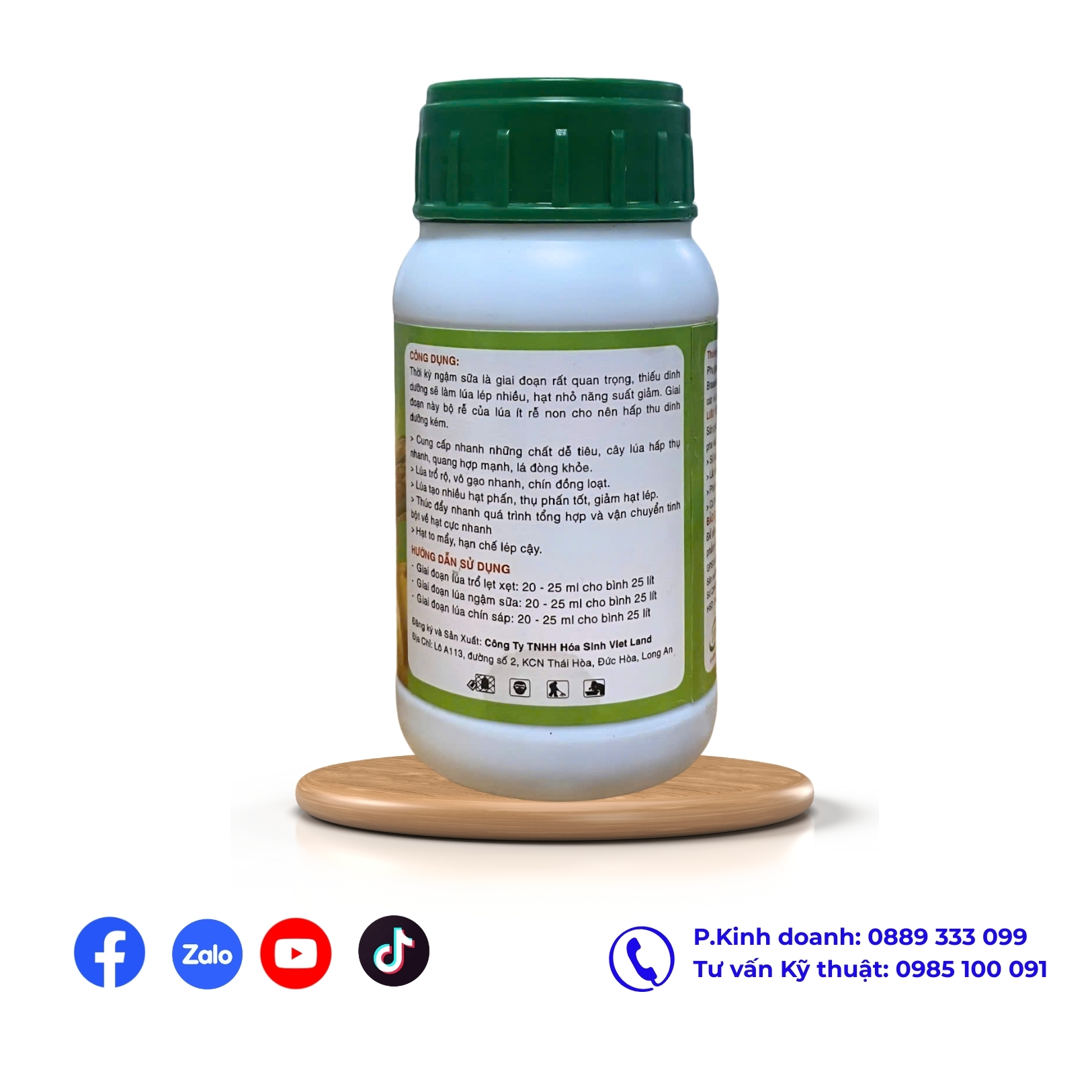 - Cung cấp nhanh những chất dễ tiêu, cây lúa hấp thụ nhanh, quang hợp mạnh, lá đòng khỏe. - Lúa trổ rộ, vô gạo nhanh, chín đồng loạt. - Lúa tạo nhiều hạt phấn, thụ phấn tốt, giảm hạt lép. - Thúc đẩy nhanh quá trình tổng hợp và vận chuyển tinh bột về hạt cực nhanh. - Hạt to mẩy, hạn chế lép cậy.