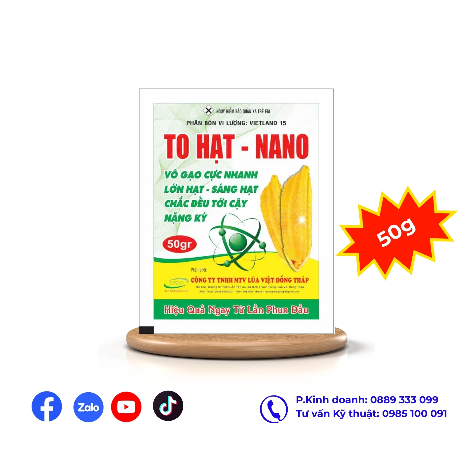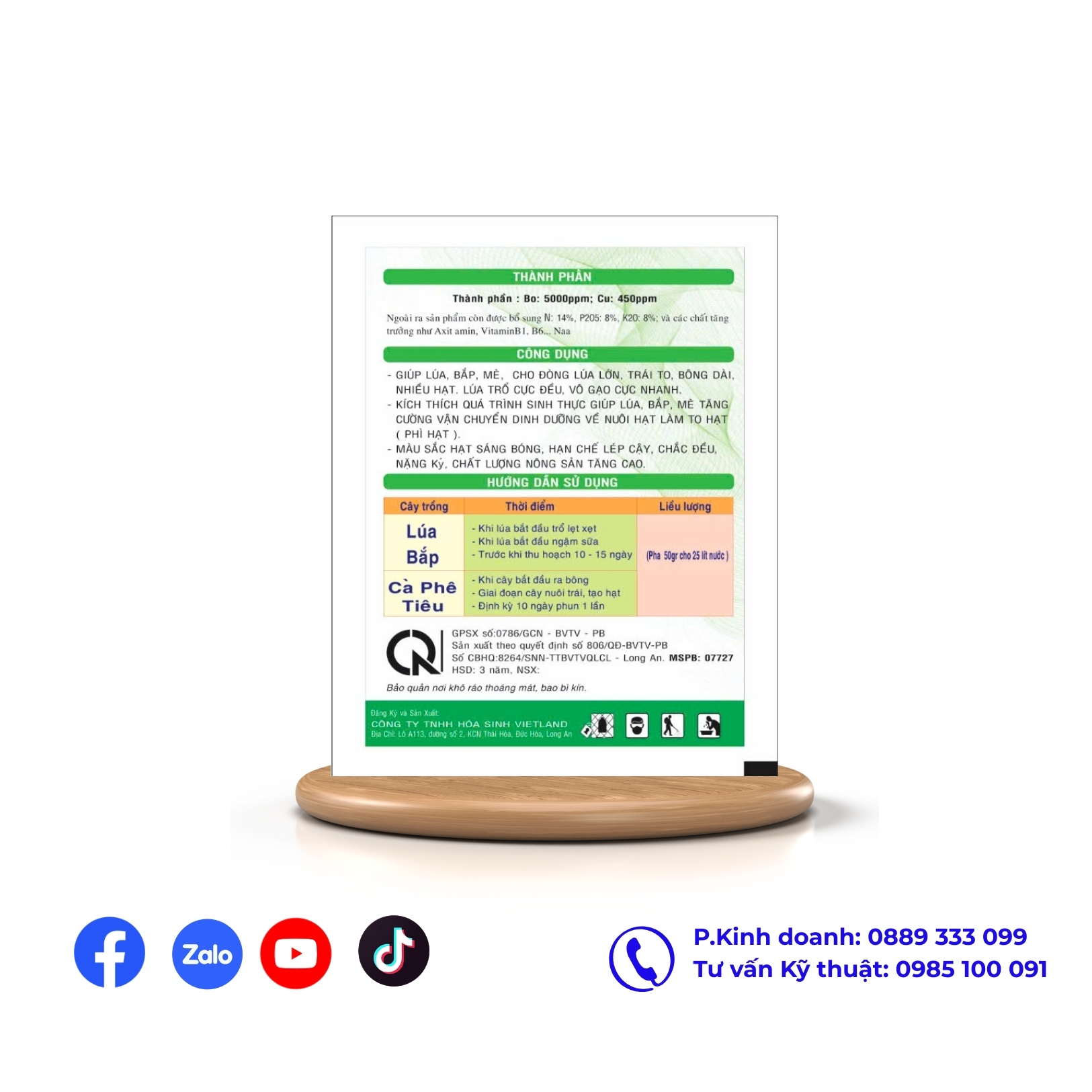 - Vô gạo cực nhanh, lớn hạt, sáng hạt, chắc đều tới cậy, nặng ký. - Giúp lúa, bắp, mè cho đòng lớn, trái to, bông dài, nhiều hạt. Lúa trổ cực đều, vô gạo cực nhanh. - Kích thích quá trình sinh thực giúp lúa, bắp, mè tăng cường vận chuyển dinh dưỡng về nuôi hạt làm to hạt (phì hạt). - Màu sắc hạt sáng bóng, hạn chế lép cậy, chắc đều, nặng ký, chất lượng nông sản tăng cao.
